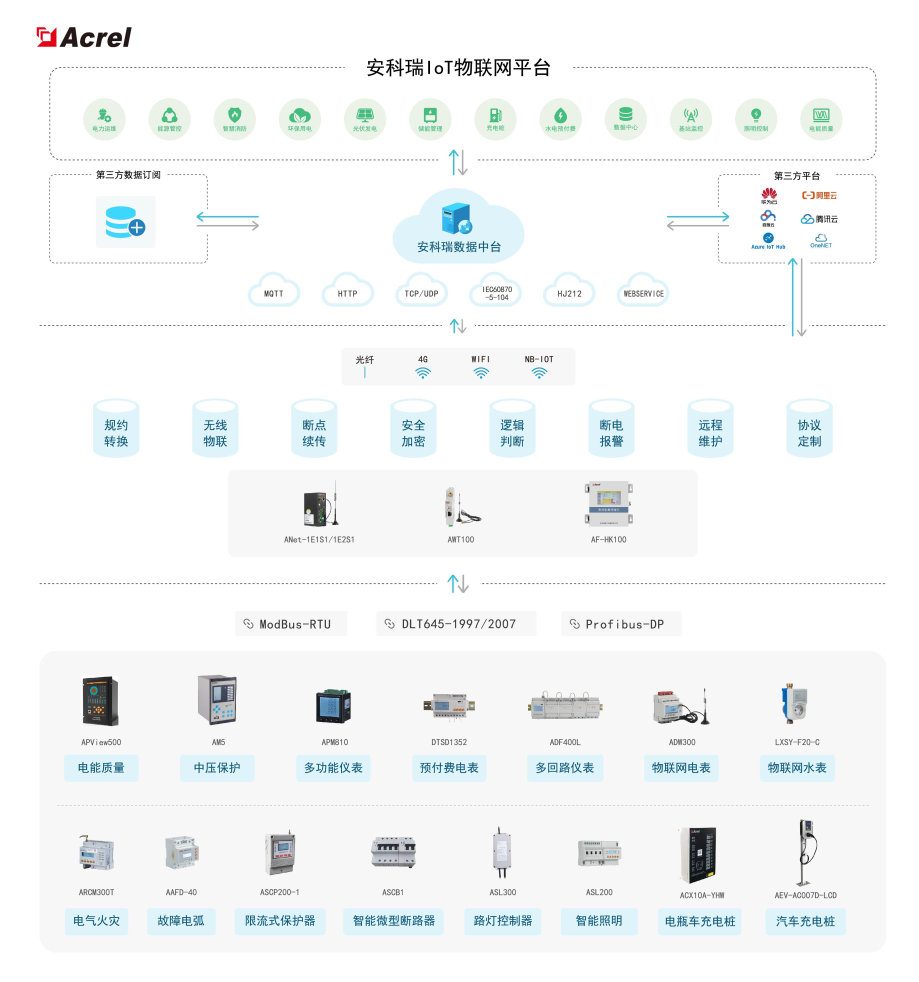 國家全面推進打贏藍天保衛(wèi)戰(zhàn),打好碧水保衛(wèi)戰(zhàn),打勝凈土保衛(wèi)戰(zhàn),加快生態(tài)環(huán)境保護、建設美麗中國。環(huán)保用電監(jiān)管系統針對企業(yè)內的環(huán)保設施、設備運行狀況進行檢測,發(fā)揮環(huán)保設備的作用,提高監(jiān)察效率,并為環(huán)保部門能夠動態(tài)掌握治污治理執(zhí)行情況和異常預警提供支持,安科瑞憑借監(jiān)控領域里多年的技術力量和豐富經驗,創(chuàng)新研發(fā)了AcrelCloud-3000環(huán)保設施用電監(jiān)管云平臺,依托快速發(fā)展的物聯網技術、電力參數傳感技術,實時采集企業(yè)總用電、工藝生產設備用電、污染治理設施設備用電等數據,通過設施運行停車分析、越限分析、停/限產分析、工藝關聯分析等,及時發(fā)現環(huán)保治理設施、設備等未開啟、空轉、減速、降頻以及異常關閉等未正常工作的情況;同時,通過數據分析,還可以實時監(jiān)控限產和停產整治企業(yè)運行狀態(tài)。